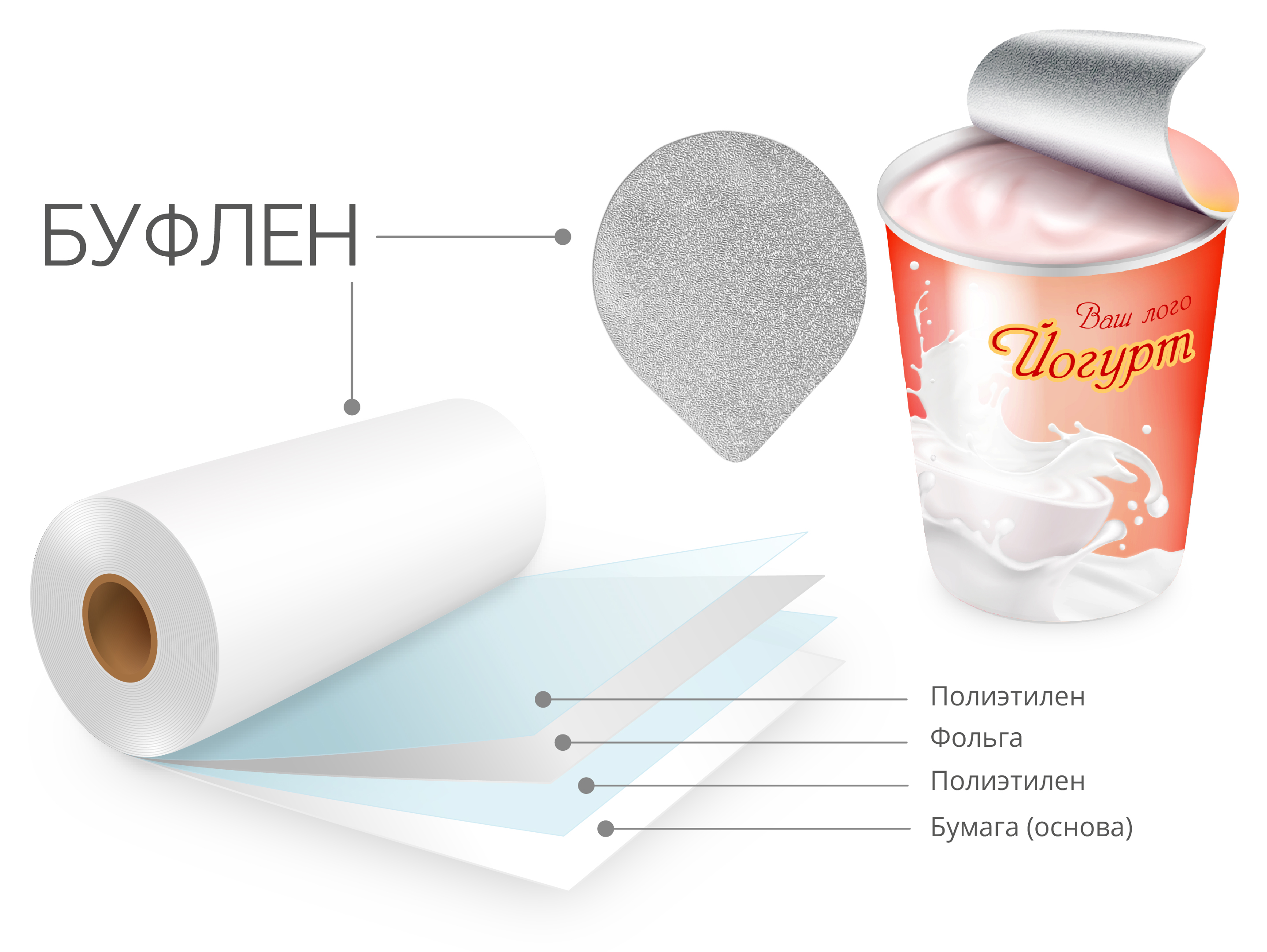 Материал Буфлен PRIME BF — это четырехслойный материал, состоящий из алюминиевой фольги и бумаги, соединенных расплавом полиэтилена, и дополнительного слоя полимера, нанесенного на фольгу.