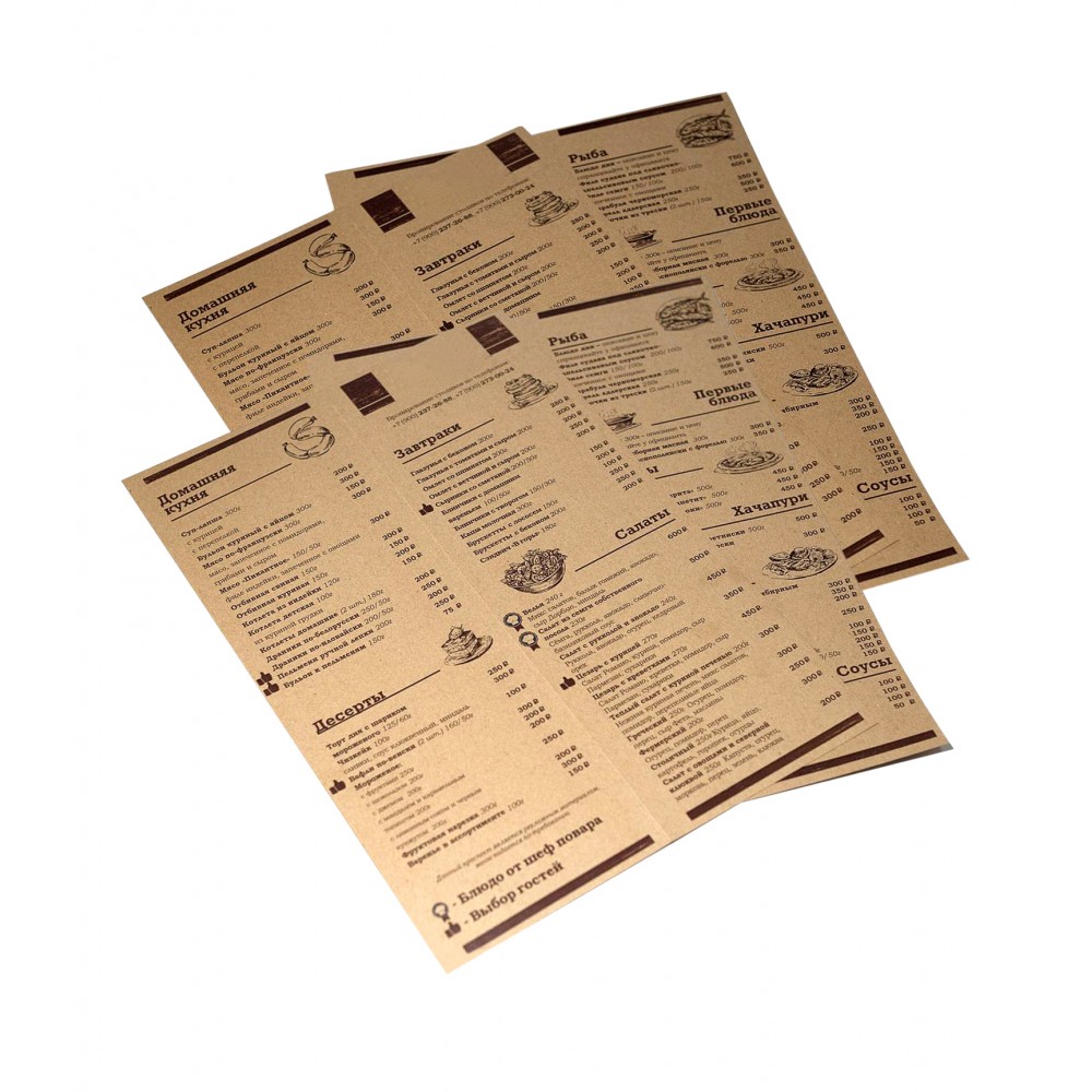 Бумажные плейсметы (placemat, плейсматы, плейсмэты) - это сервировочные салфетки под приборы, которые размещаются поверх скатерти, подноса, либо непосредственно на столешнице. Плейсметы из крафт-бумаги представляют собой листы разных форматов под тарелки и столовые приборы. На листах обычно размещается логотип ресторана, а также фрагменты меню, либо реклама заведения. Бумажные плейсметы для кафе и ресторанов – это не только удобный вариант сервировки стола, но и простой способ ненавязчиво рекламировать своё заведение и его услуги.